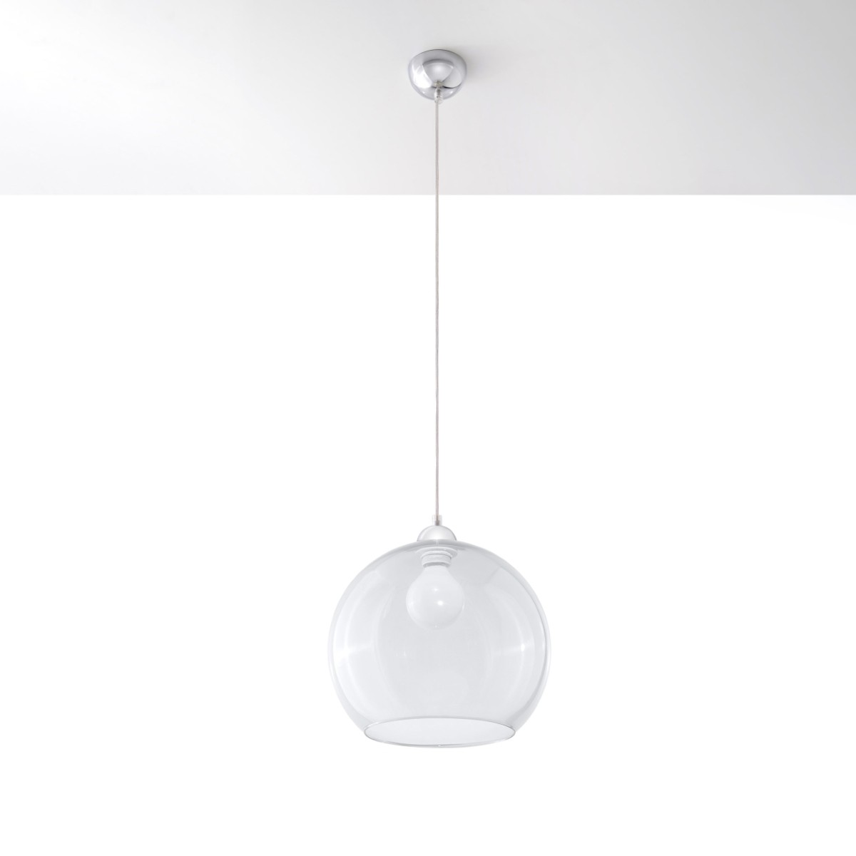 Klosz o kształcie kuli jest wykonany ze szkła, więc idealnie rozprasza światło w pomieszczeniu. W rezultacie dociera ono równomiernie we wszystkie zakątki i estetycznie się prezentuje.