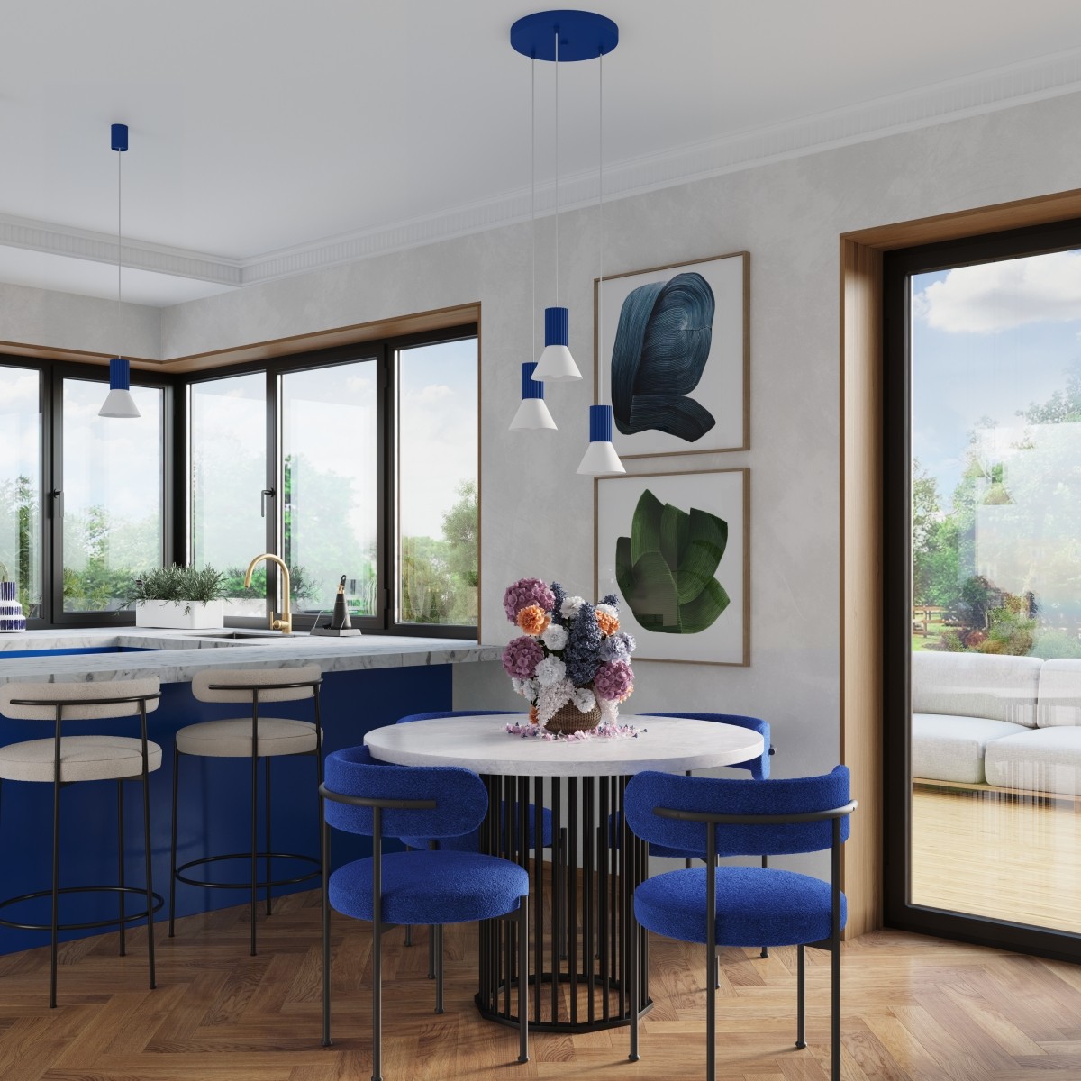Lampa ESTRIA dostępna jest w dwóch wersjach: wisząca 1 i 3, które różnią się rozmiarem, ale wszystkie charakteryzują się tym samym wyjątkowym designem i funkcjonalnością. Kolorystyka lampy łączy elegancką biel, beż oraz ultramarynę, które doskonale wpisują się w każde wnętrze, tworząc spójną aranżację.