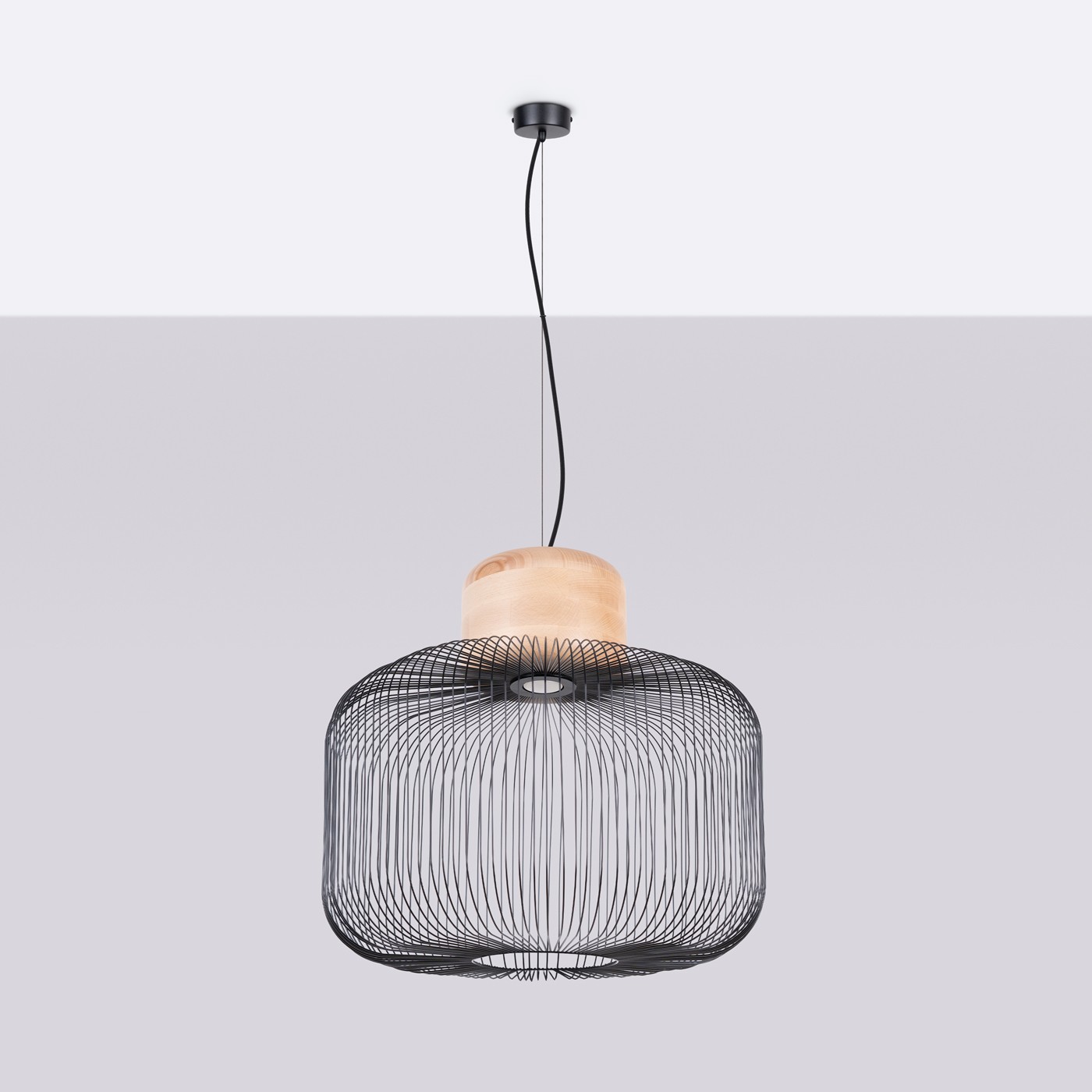 Lampa GABBIA to wyjątkowe zestawienie naturalnego drewna z lekką, a jednocześnie solidną konstrukcją wykonaną ze stali. Drewniany element w górnej części dodaje całości ciepła i naturalności, natomiast stalowy, ażurowy klosz w kolorze czerni nadaje lampie nowoczesny i lekko industrialny charakter.
