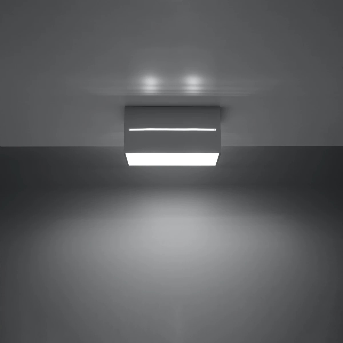 Plafon LOBO świeci w dół, ale blask sączy się także przez liniową perforację w bocznych ścianach klosza. Gdy go zaświecisz, zamienisz cały sufit w efektowną dekorację.