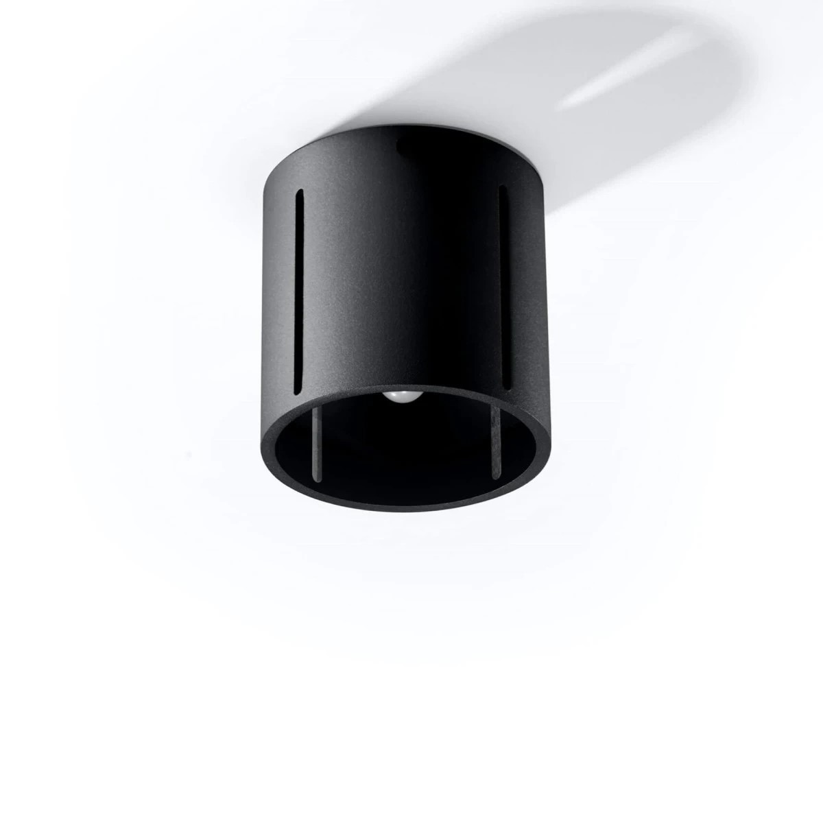 Plafon INEZ świeci w dół, ale blask sączy się także przez liniową perforację w bocznych ścianach klosza. Gdy go zaświecisz, zamienisz cały sufit w efektowną dekorację.