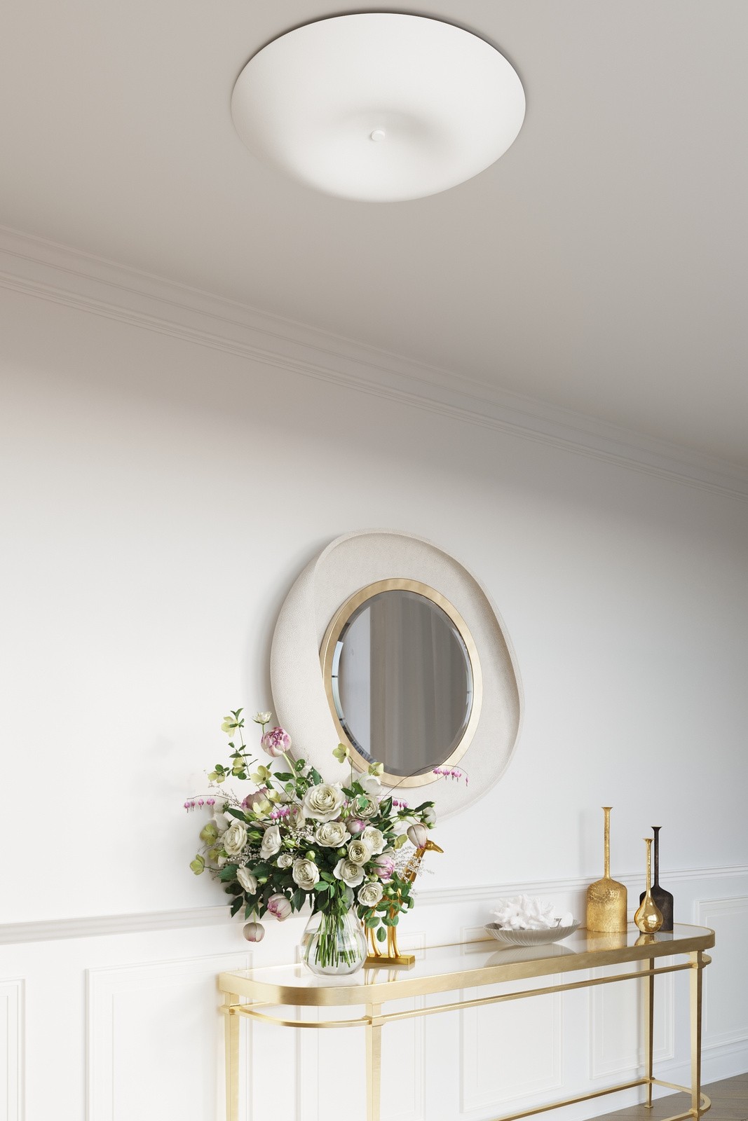 Plafon FUSION nie przytłacza swoją formą. Staje się delikatnym tłem, pozwalając przy tym lśnić innym elementom dekoracyjnym. Dopasuje się do minimalistycznych nowoczesnych wnętrz, a także tych bardziej przytulnych, pełnych ozdób i bibelotów.