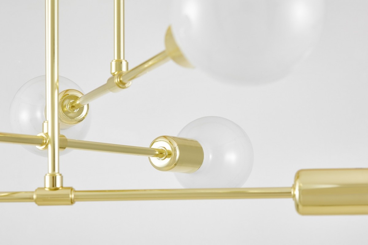 Lampa wisząca złota NOVA W6 łączy sześć kloszy w kształcie żarówek z ciepłym odcieniem metalu. Ten model zapewnia elegancki akcent we współczesnym wydaniu do różnego typu wnętrz.