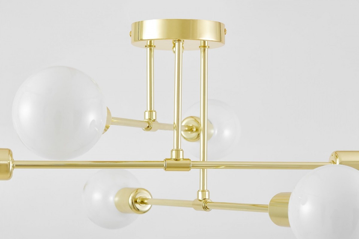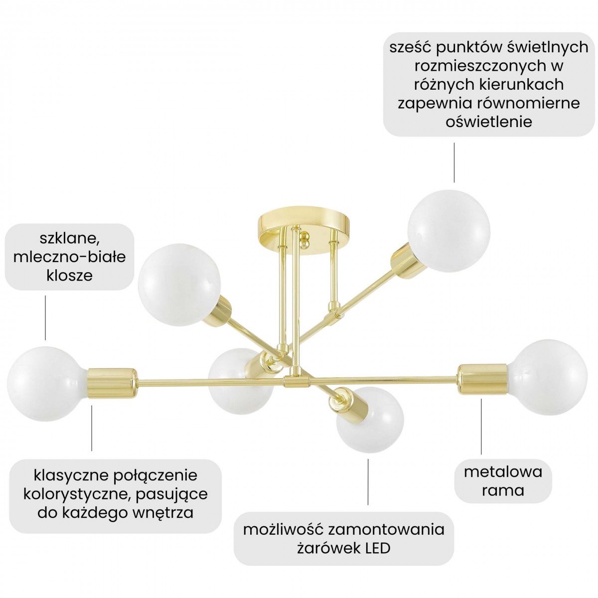 Złota oprawa wprowadza do wnętrza subtelny akcent luksusu. Świetnie komponuje się zarówno z naturalnym drewnem i jasnymi tkaninami, jak i z marmurem czy ciemniejszymi barwami, tworząc elegancki kontrast. W mniejszych mieszkaniach ta złota lampa sufitowa z białymi kloszami pozwala zredukować ilość dodatkowych dekoracji, bo sama staje się mocnym punktem wystroju. W przestronnych wnętrzach zyskuje charakter reprezentacyjny, nadając pomieszczeniu wyraźny styl.