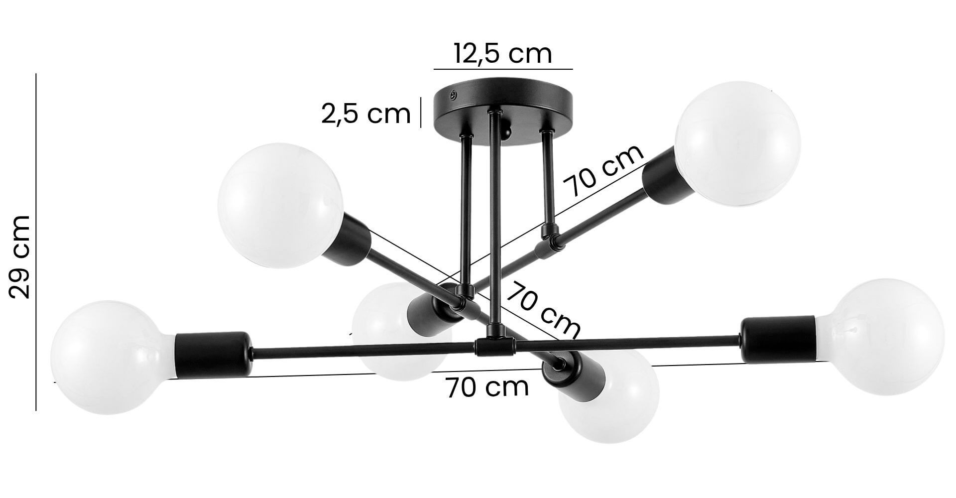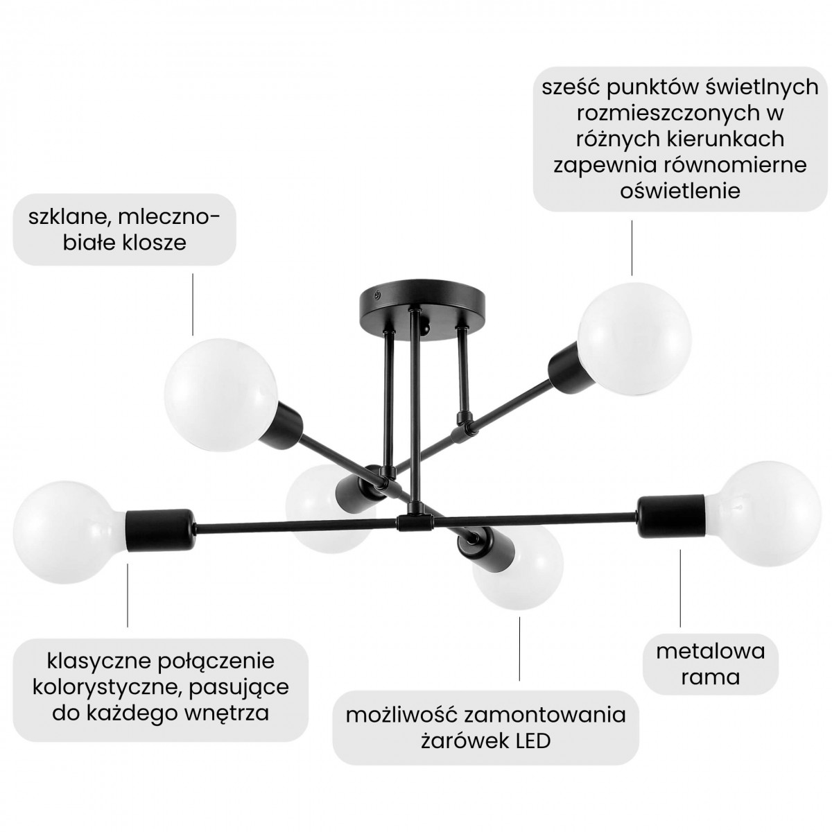 NOVA W6 to stylowa lampa sufitowa w kolorze czarnym, która łączy komfort i współczesną estetykę. Dzięki sześciu mlecznym kloszom rozprasza światło w przyjemny, równomierny sposób. Dzięki odpowiedniej instalacji lampa może działać w dwóch sekcjach, uruchamianych włącznikiem dwuprzyciskowym. W kuchni podświetla przestrzeń roboczą i stół, w salonie podkreśla kolor mebli i dodatków. Jako lampa wisząca do sypialni nie rozprasza uwagi podczas wypoczynku, a wspiera spokojne chwile relaksu.