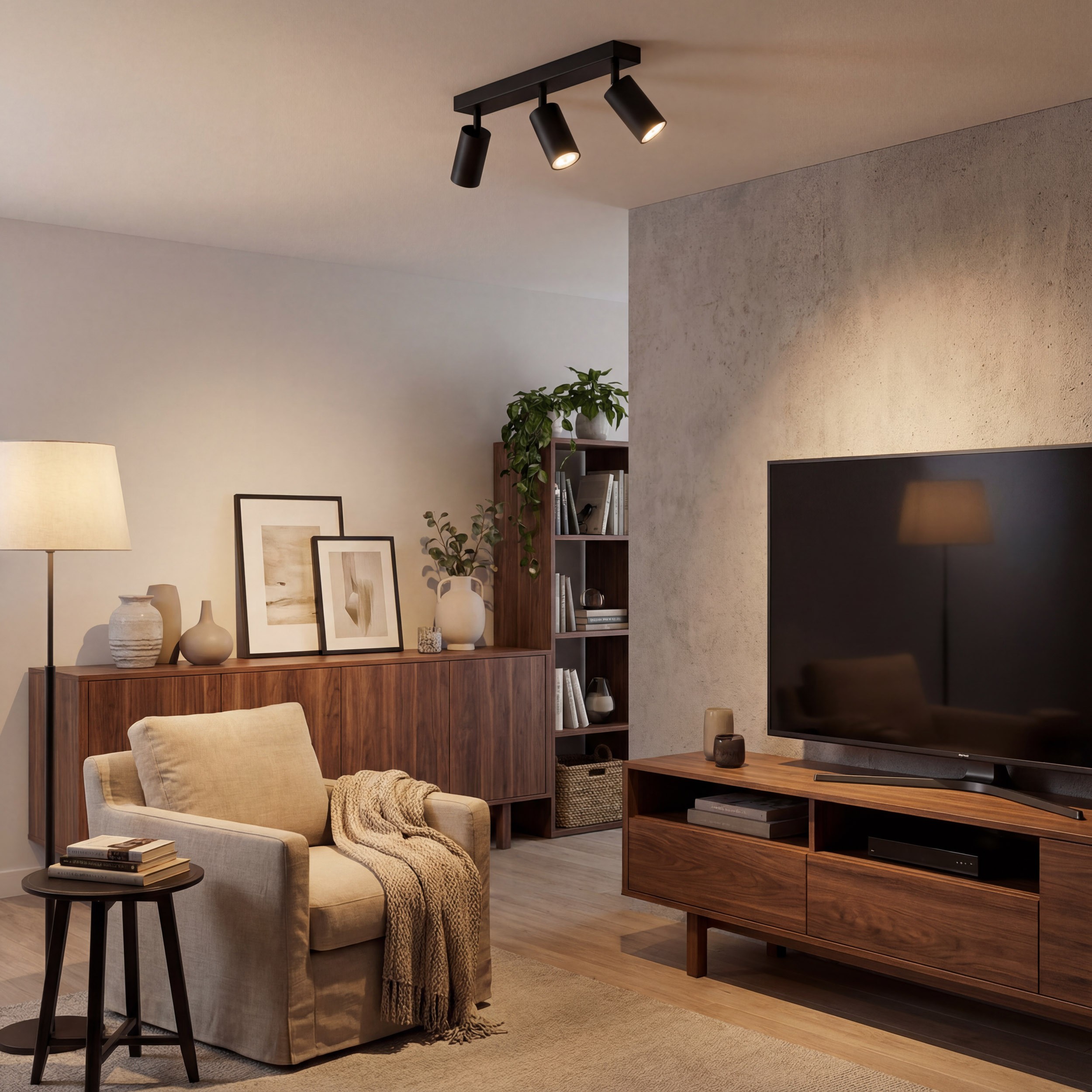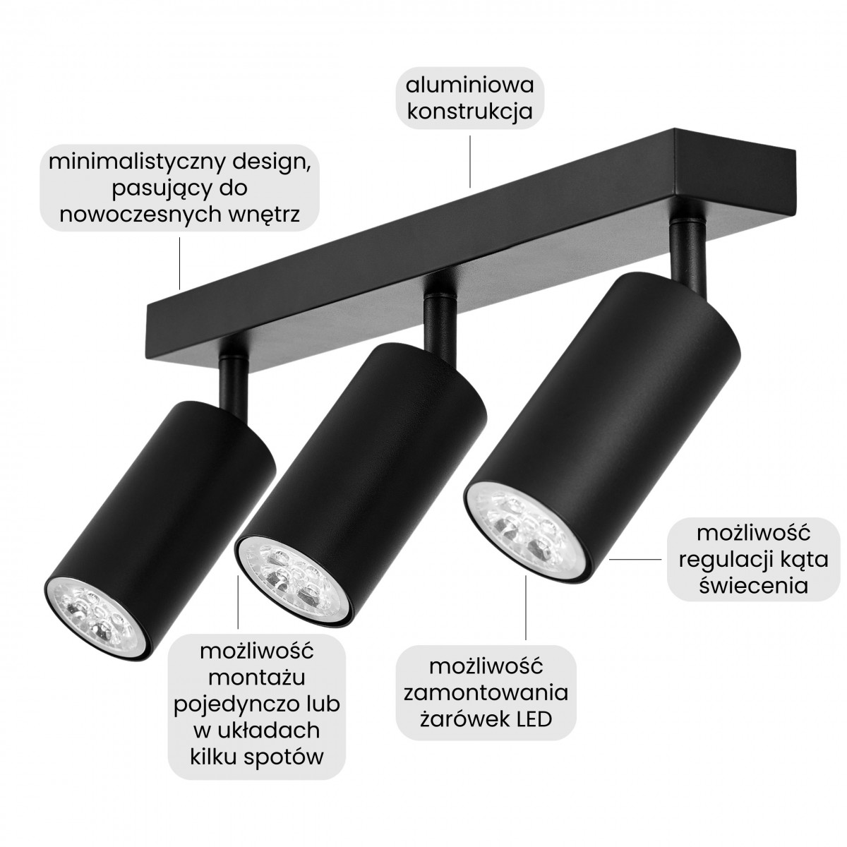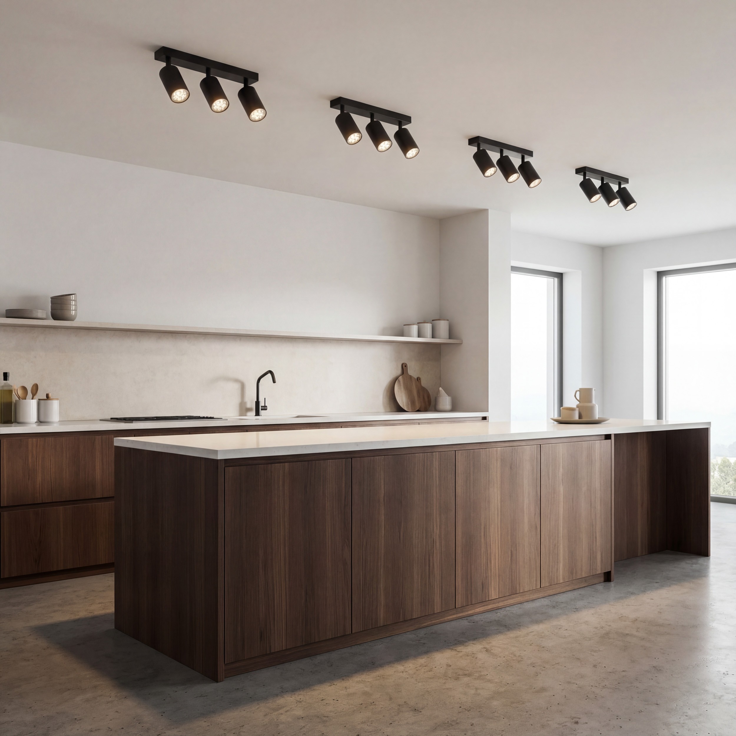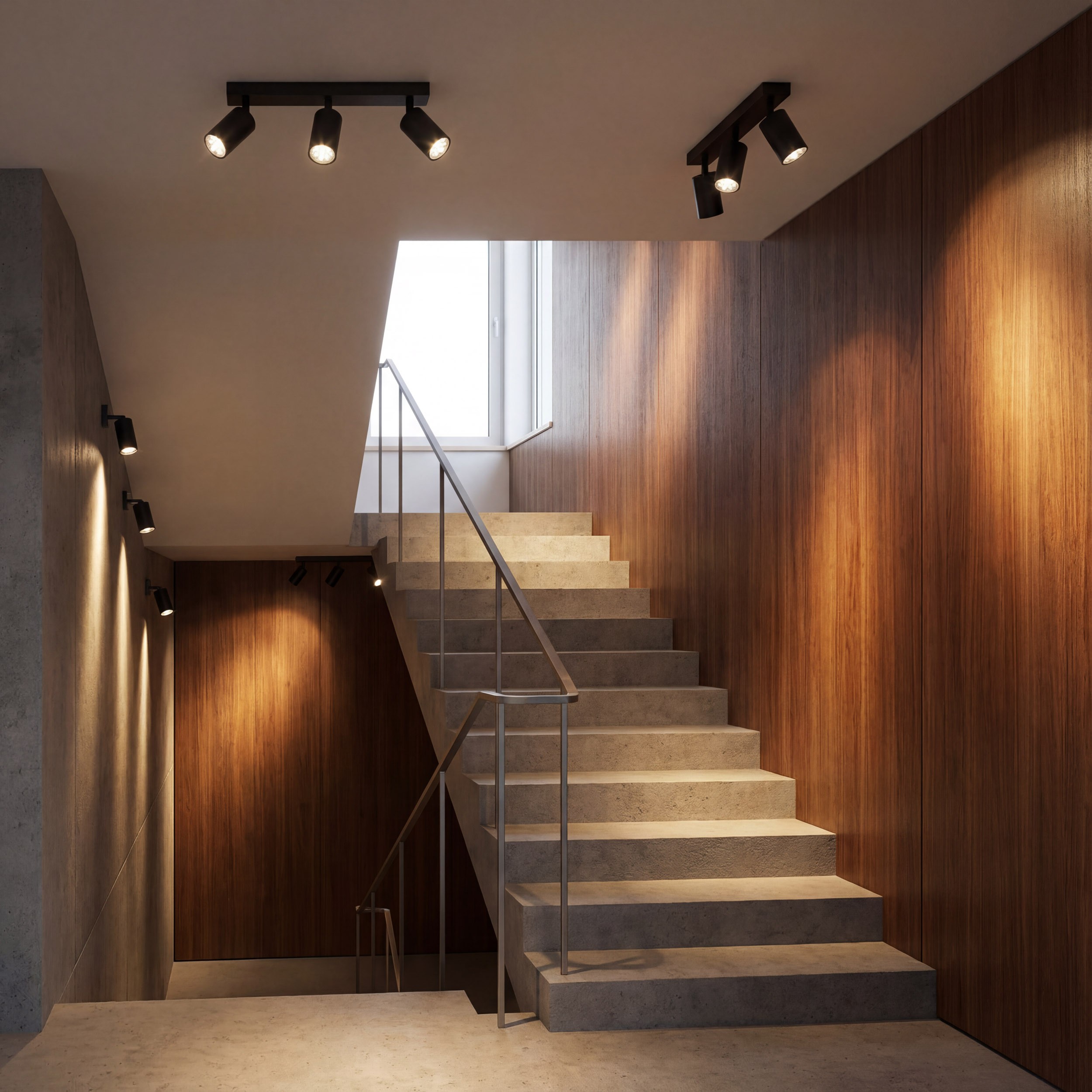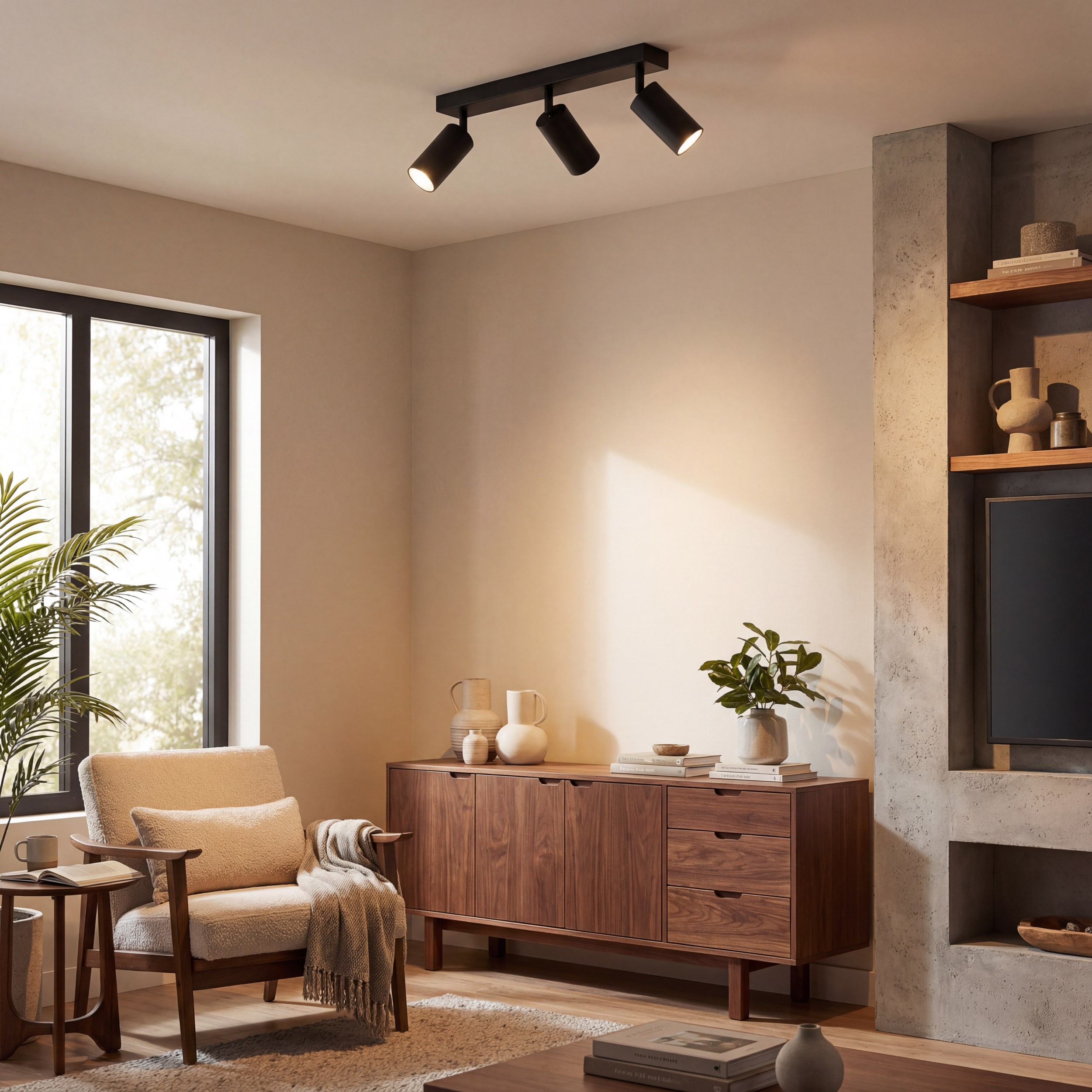 Potrójny spot w formie tub na listwie umożliwia ustawianie światła w różnych kierunkach tak, aby stworzyć oświetlenie dopasowane do rytmu pomieszczenia. Taki układ świetnie sprawdza się nad blatem w kuchni, w korytarzu lub jako spot do salonu, gdzie światło ma subtelnie podkreślać wybrane miejsca, a jednocześnie zapewniać komfort codziennych czynności. To model, który dobrze współgra z naturalnymi i nowoczesnymi materiałami.