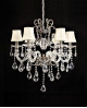Ekskluzywny żyrandol kryształowy do salonów, wystawnych sali konferencyjnych, hoteli, a także innych stylizowanych lokali. Luksus wynikający z designu, jak i mistrzowskiego zestawienia materiałów — mosiężnego metalu, szkła, kryształu i kremowej tkaniny. Synonim bogactwa i funkcjonalności. Zbudowany z 6 abażurów, mosiężnej podsufitki i regulowanego zdobnego łańcucha.