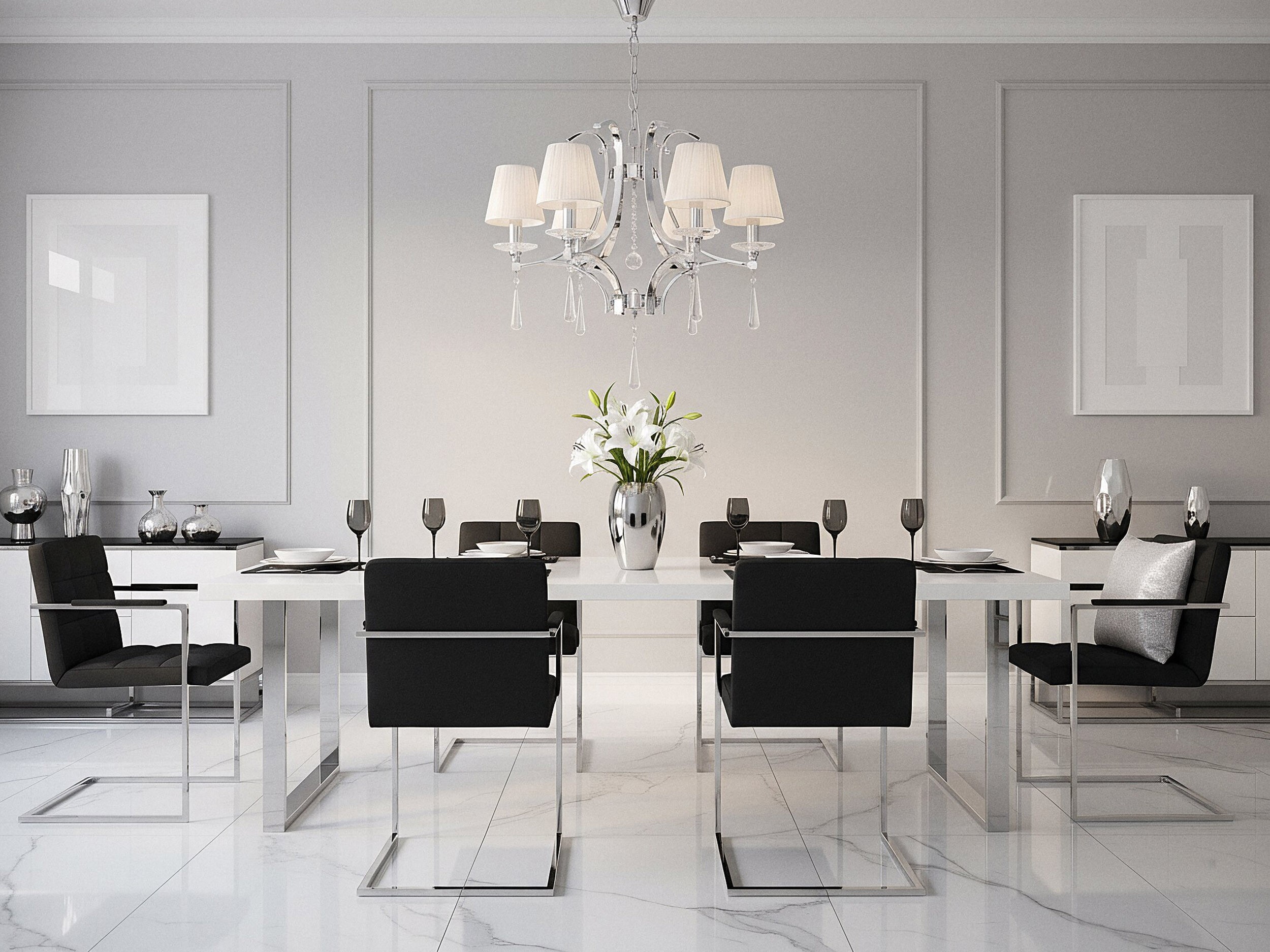 Żyrandol kryształowy VENISIA to uosobienie stylu i klasy, jak i bogatego zdobnictwa, które wraz z tradycyjną formą o sześciu abażurach i chromowaną oprawą tworzą reprezentację stylu klasycznego. Ze względu na swój majestatyczny wygląd i szlachetne kryształowe dekoracje doskonale odnajdzie się w okazałym salonie oraz jadalni, jak również w eleganckich restauracjach i salach bankietowych.