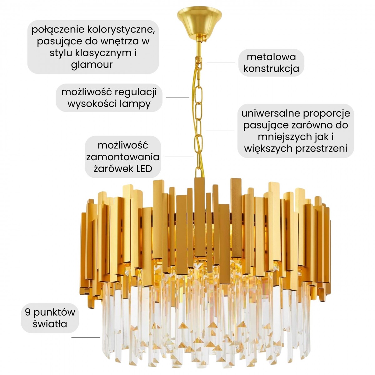 FERA D50 to okazały, złoty żyrandol o średnicy 50 cm, zbudowany z geometrycznych złotych paneli i długich, transparentnych kryształów, które tworzą wyjątkową, przestrzenną formę. Dziewięć punktów świetlnych ukrytych wewnątrz oprawy ożywia całość, a kryształowe elementy pięknie rozświetlają wnętrze.