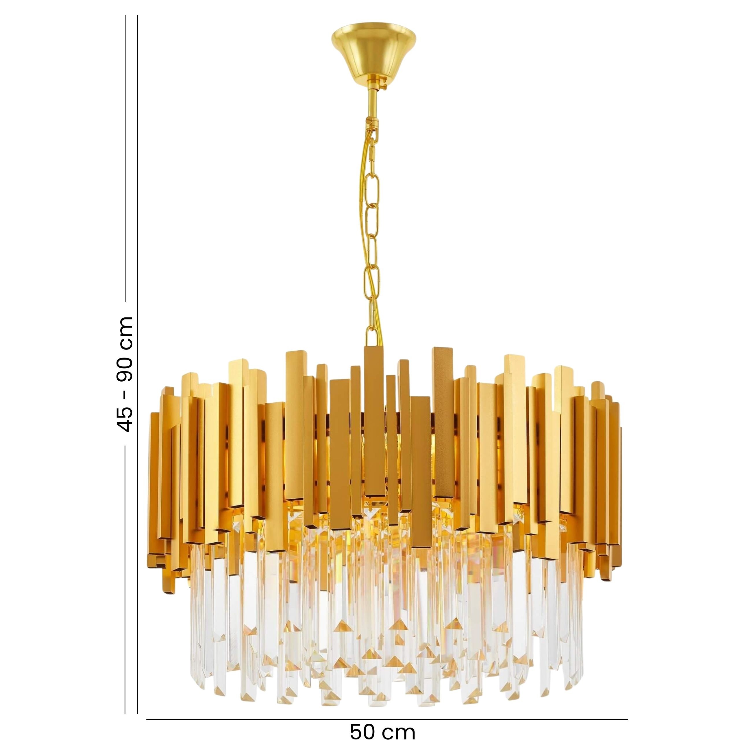 FERA D50 to okazały, złoty żyrandol o średnicy 50 cm, zbudowany z geometrycznych złotych paneli i długich, transparentnych kryształów, które tworzą wyjątkową, przestrzenną formę. Dziewięć punktów świetlnych ukrytych wewnątrz oprawy ożywia całość, a kryształowe elementy pięknie rozświetlają wnętrze.