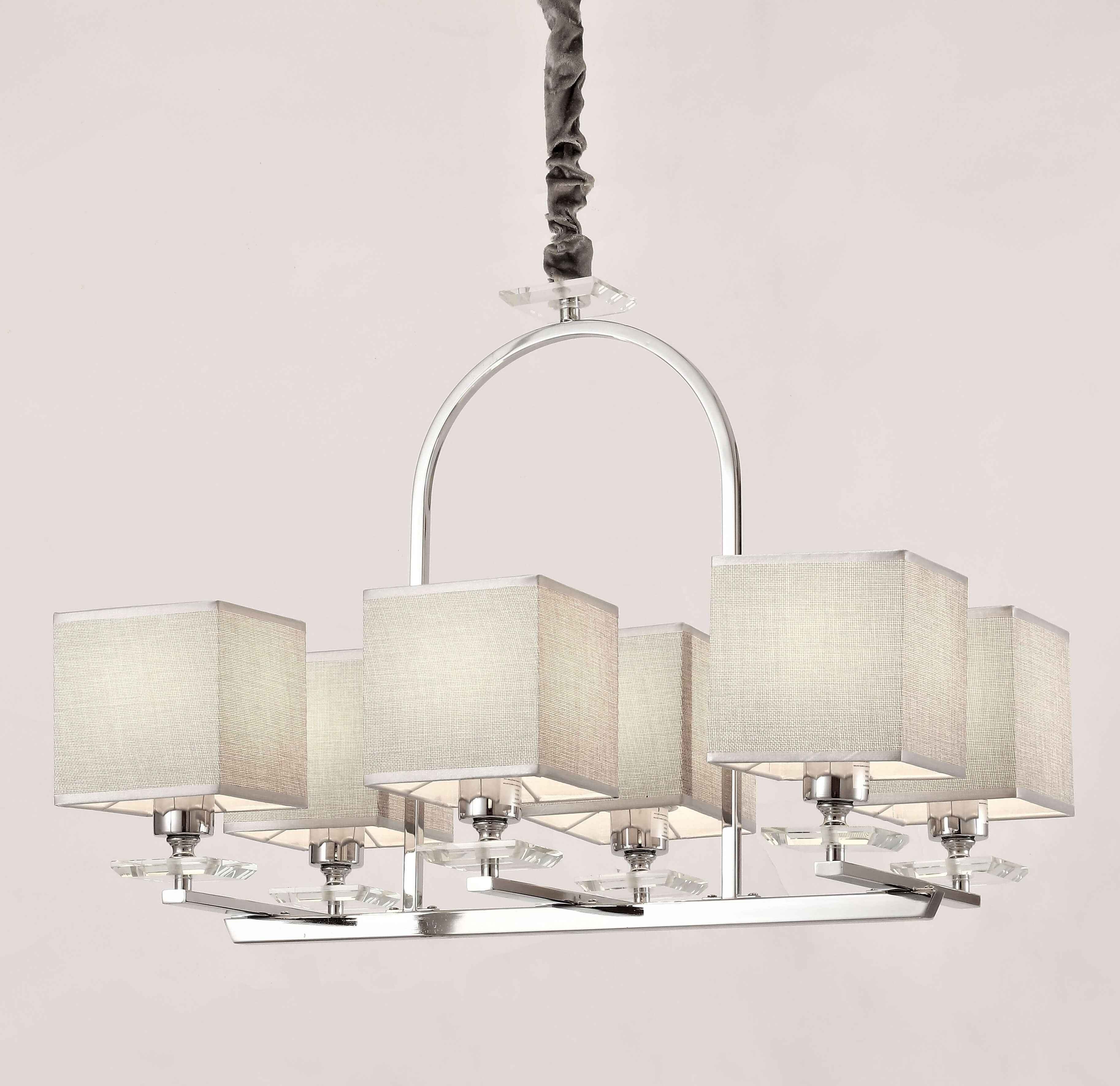 Serią LINIANO oczarowani będą wielbiciele gustownych dodatków o tradycyjnym wyglądzie z widoczną nutą nowoczesności. Metalowa konstrukcja, na której opiera się lampa wisząca, składa się z solidnej poprzeczki, na której osadzono ramiona, oraz z uchwytu o zaokrąglonym kształcie, na górze którego zamocowano wysokojakościową, kryształową ozdobę. Ten sam element dekoracyjny pełni funkcje podstaw pod kwadratowe abażury. Lampa posiada ich sześć i wykonane zostały z grubej tkaniny, która finezyjnie rozprowadza światło po pomieszczeniu.