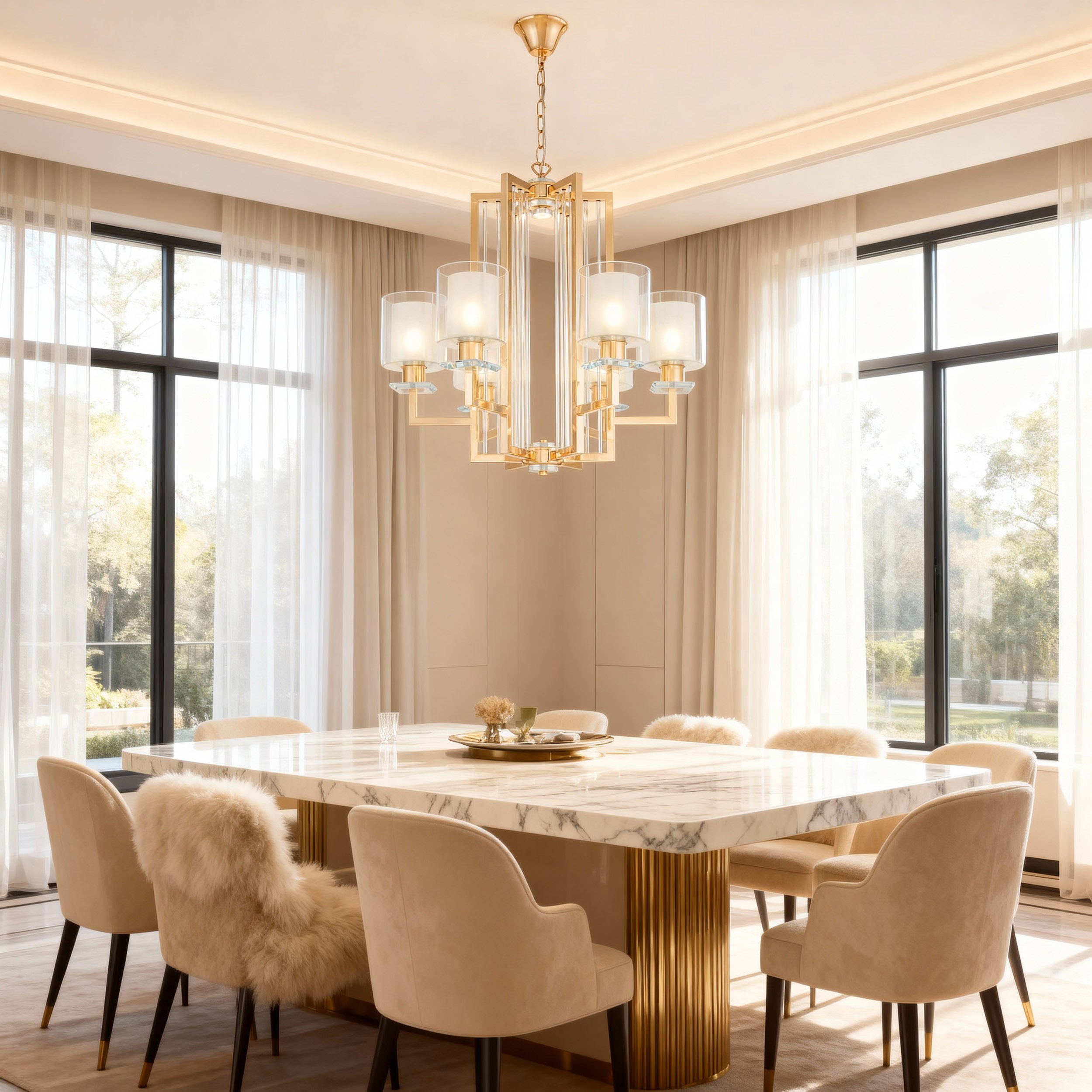 Przyglądając się bliżej kolekcji MANHATTAN, dostrzec można, że jej stonowany charakter jest tylko pozorny, a w modelach tej serii wiele się dzieje – poczynając od liczby źródeł światła, przez ciekawą konstrukcję, aż po liczne zdobienia. Bryła lampy wiszącej wykonana została w większej części z metalu w kolorze złotym. Charakterystyczna jest tutaj geometryczna struktura połączonych prostokątów, tworzących przeplatające się ze sobą ramki. Z centrum kompozycji wyłania się sześć złotych ramion wygiętych ku górze, które kończą się szklanymi podstawami pod oprawy w kształcie kwadratów. Na nich spoczywają klosze wykonane z podwójnych szklanych ścianek – wewnętrznej mlecznej oraz zewnętrznej przezroczystej, które w niezwykle oryginalny sposób oddają światło do pomieszczenia - jej subtelna elegancja umożliwia zastosowanie jej w bardziej ekskluzywnym miejscu, jakim jest restauracja czy sala bankietowa.