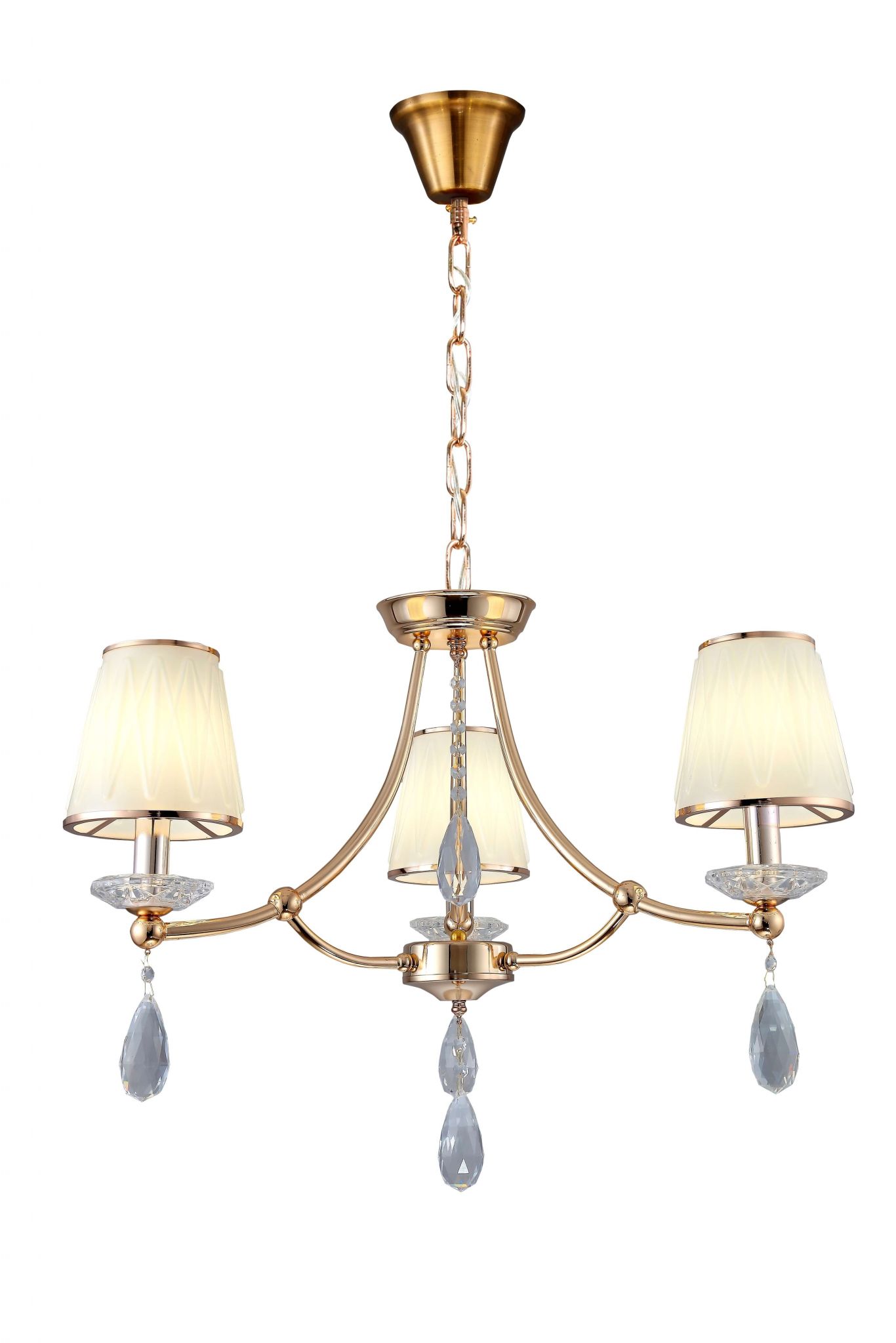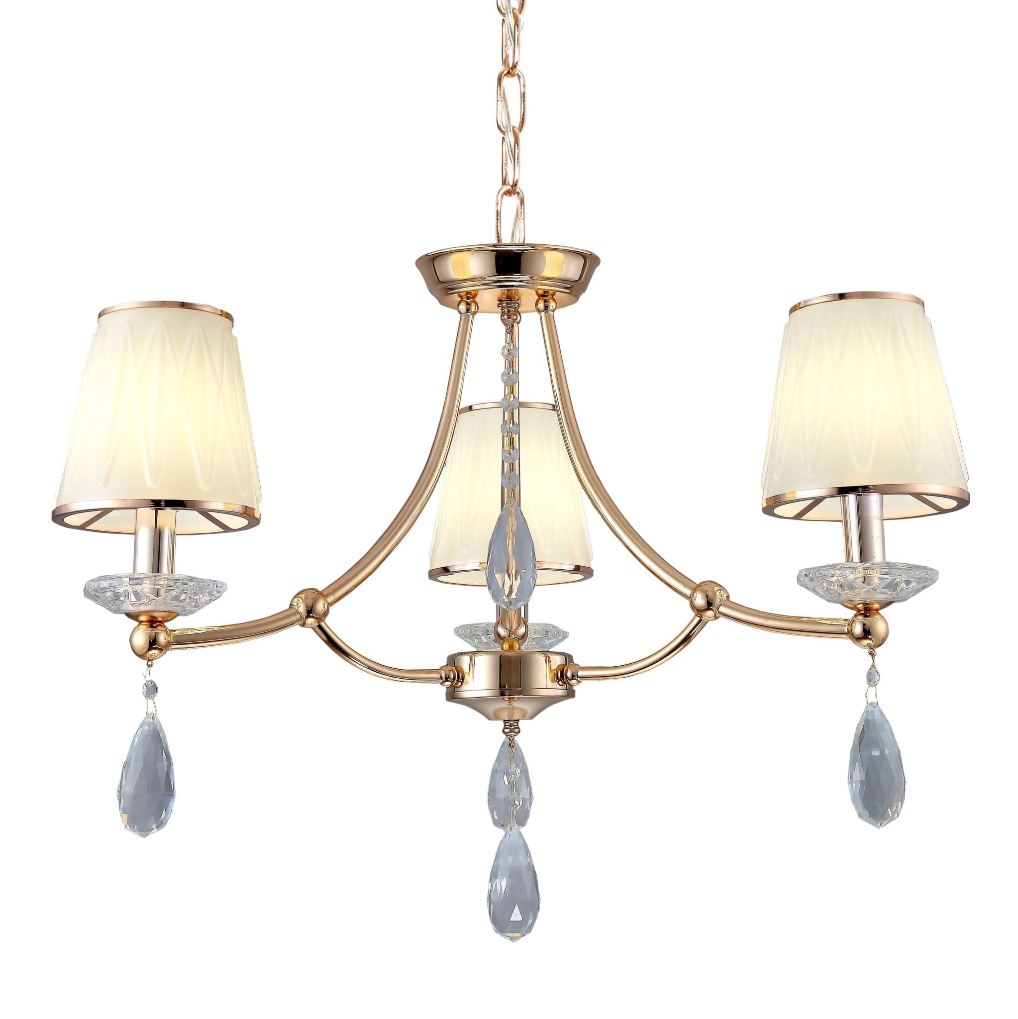 Klasyczny styl żyrandola DOMINNI W3 dostrzegalny jest od pierwszego spojrzenia na układ produktu oraz jego pełne gracji elementy dekoracyjne. Złota oprawa, wysokogatunkowe kryształowe wisiory i podstawy pod oprawy oraz trzy źródła światła pozwalają na stworzenie niebanalnej oraz wykwintnej aranżacji salonu, sypialni oraz jadalni.